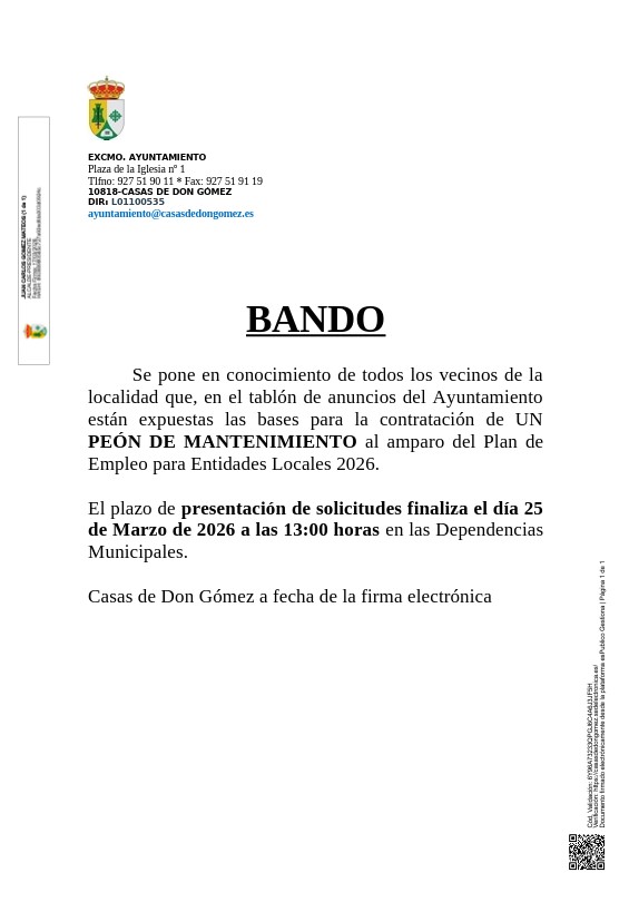 25 de Marzo - BASES CONTRATACIÓN PEÓN DE MANTENIMIENTO.